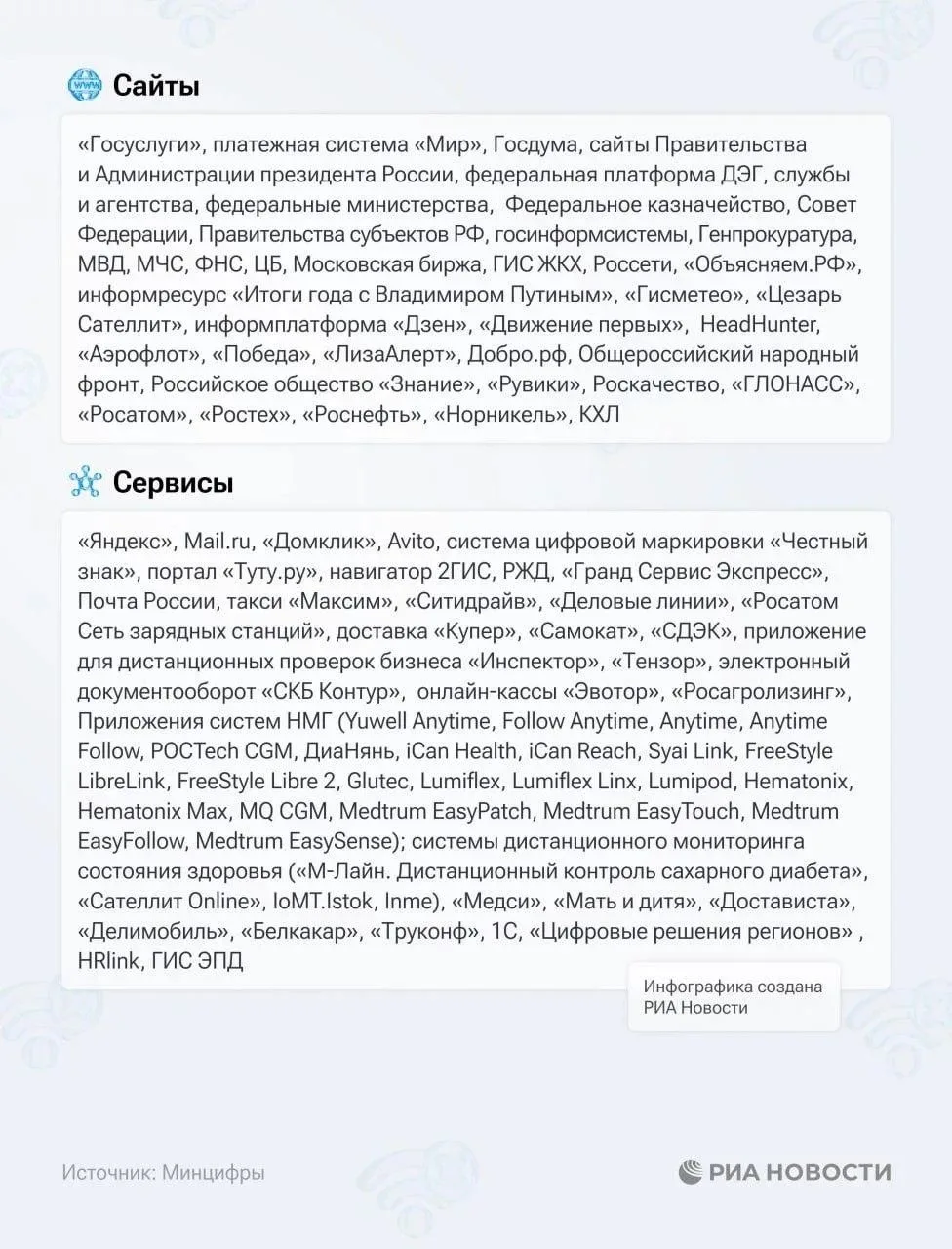 Последняя «итерация» включает в себя привычные сервисы и национальные медиа. Сейчас в перечне, сообщает Минцифры, более 500 российских сервисов, среди которых - самые популярные по данным независимого измерения. Эти ресурсы не только востребованы пользователями, но и - самое главное - отвечают требованиям безопасности. Важное условие попадания в «белый список» - расположение всех вычислительных мощностей на территории РФ.