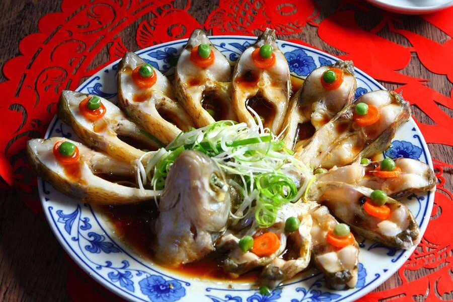 - Приготовление: Переложите рыбу в глубокую миску, залив водой с луком и имбирем для маринования на 15 минут. На тарелке аккуратно разместите голову рыбы, а вокруг нее – веером кусочки самой рыбы. На каждый фрагмент выложите морковь и имбирь, готовьте на пару 8-10 минут.
