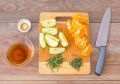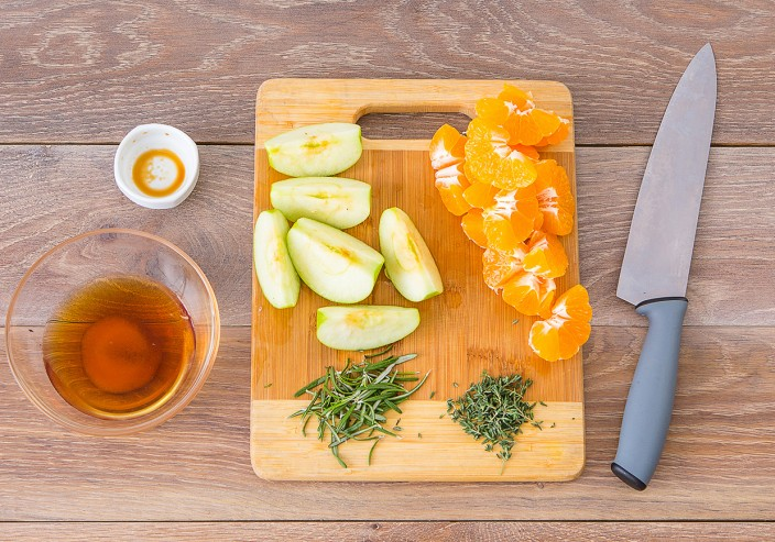 Для начала, духовку следует разогреть до 180°C. Удалить сердцевину из яблока и нарезать его дольками. Мандарины очистить, разделив на дольки. Чеснок раздавить и очистить, а зелень тимьяна и розмарина отделить от стеблей. Создайте соляной раствор, смешав 100 мл воды и 10 г соевого соуса с ? ч. л. соли, после чего наберите его в шприц.