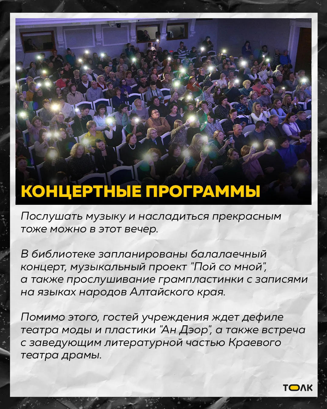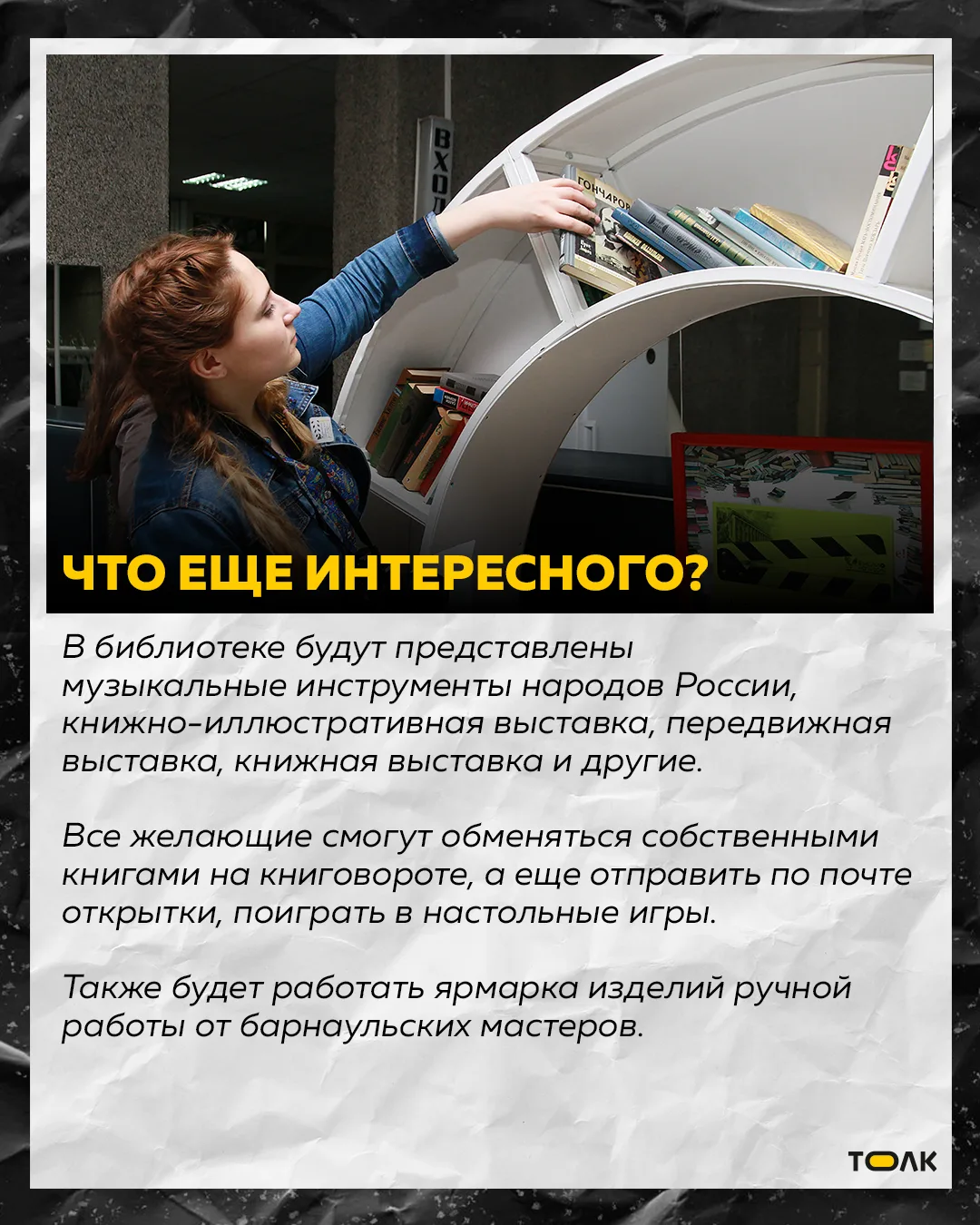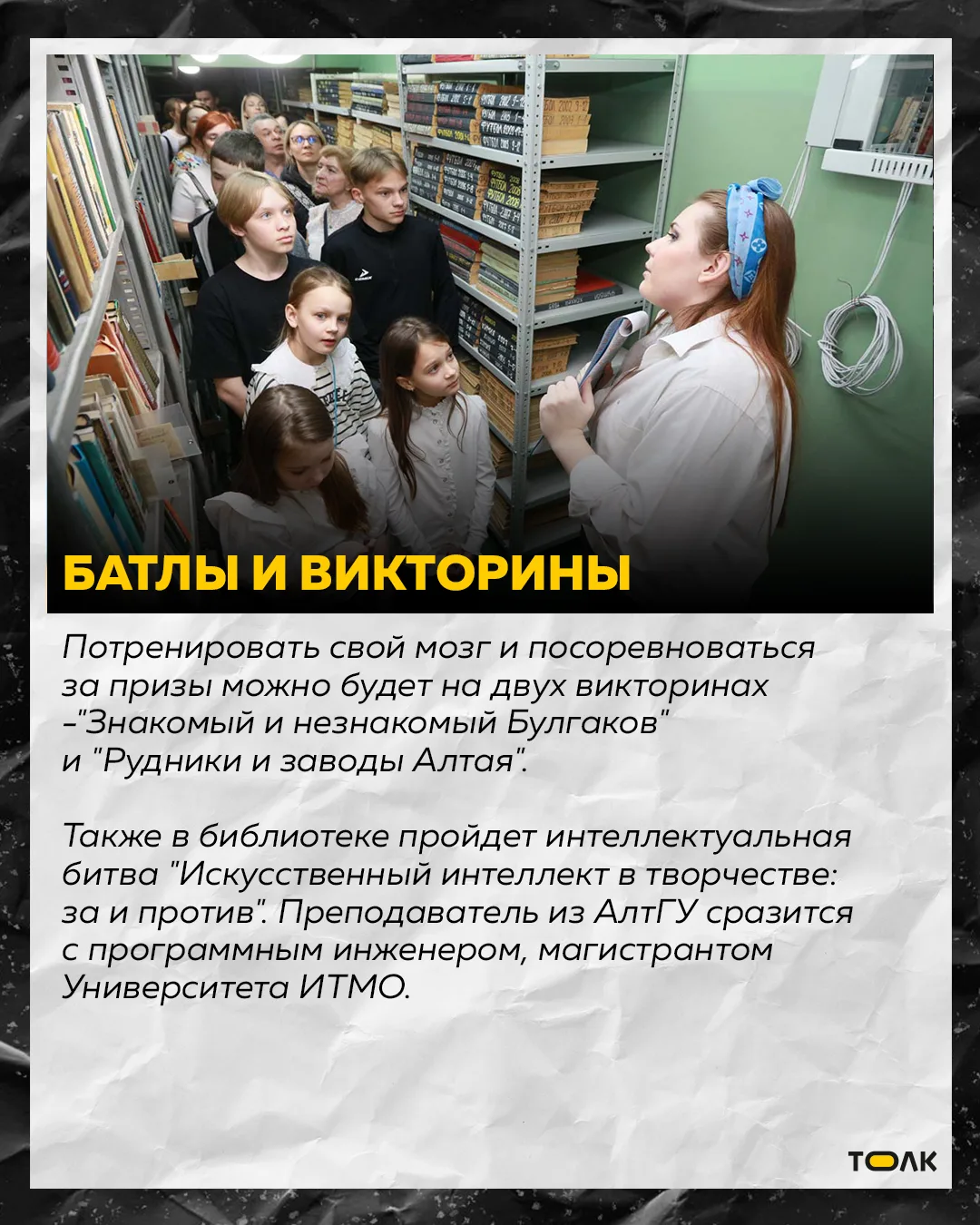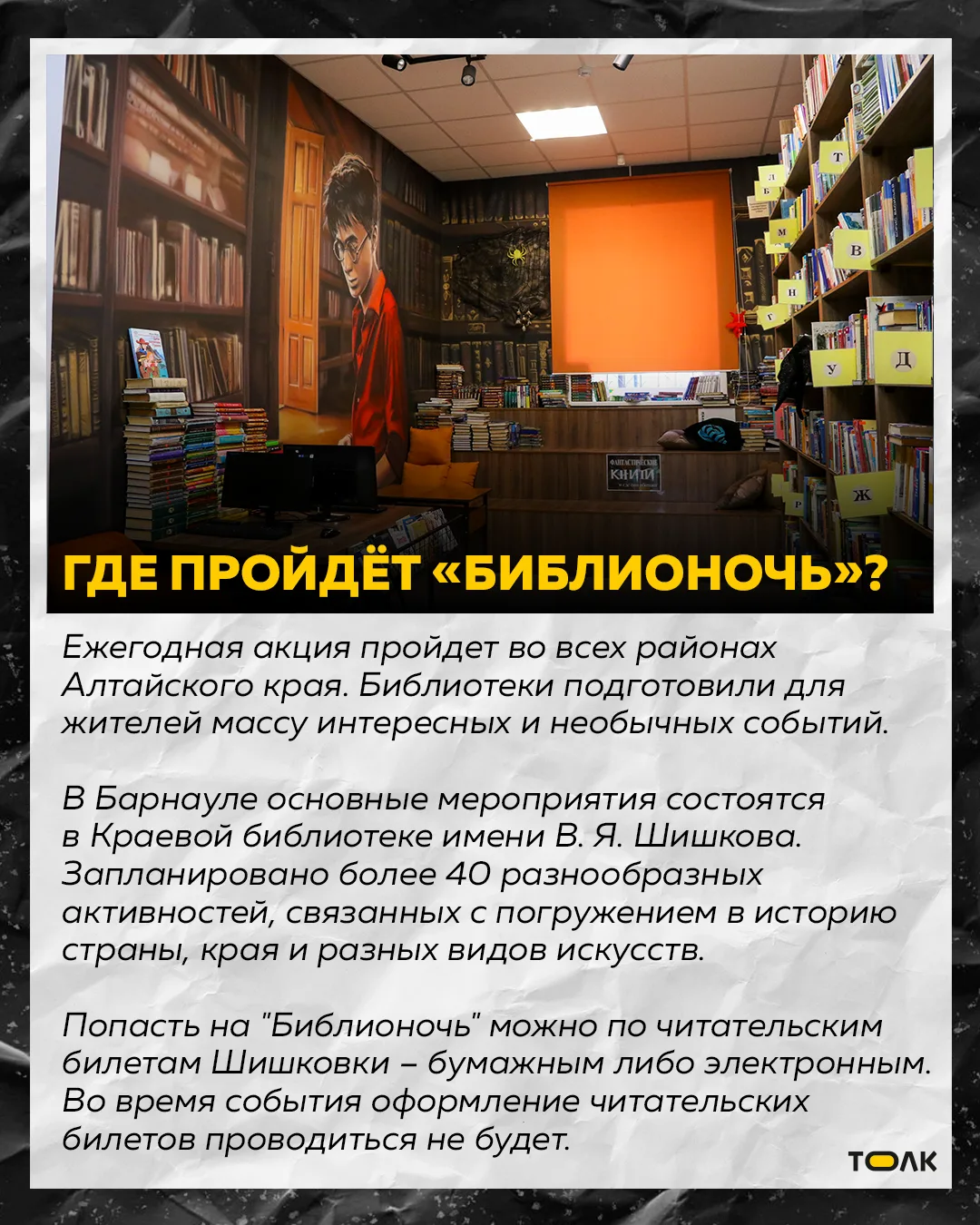 В этом году барнаульские библиотекари подготовили необычную программу, в которую вошли квесты по фондам, мастер-классы, батлы, книговороты и многое другое. О самых интересных событиях этого вечера – в материале "Толка".
