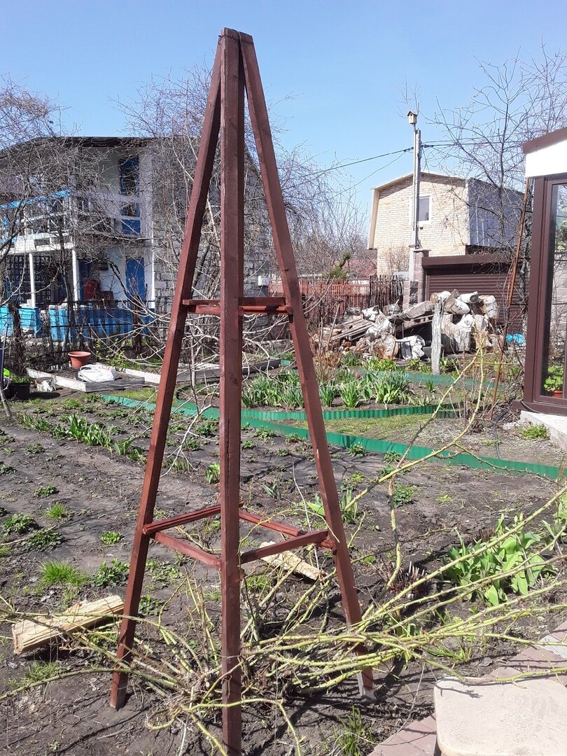 Некоторые сорта, такие как Flammentanz, создали свои собственные проблемы — длина побегов превысила три метра. Это потребовало создания нового, самодельного обелиска, найденного среди садовых материалов. Результат работы был впечатляющим, и даже старый лак для кухни, найденный в закромах, отлично подошёл для завершения конструкции.