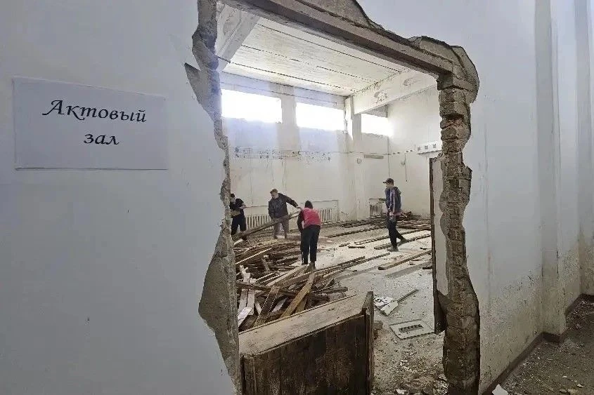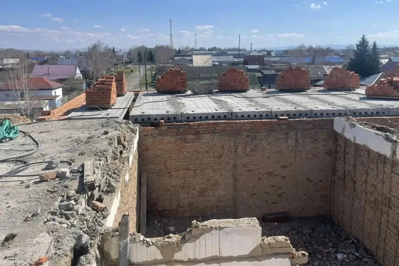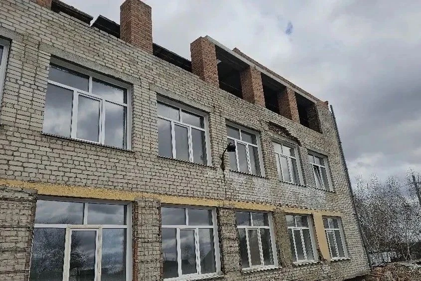 На объекте выполнены работы по демонтажу кирпичных парапетов и фронтонов. В настоящее время подрядная организация ведет замену аварийных плит покрытия третьего этажа. Специалисты демонтируют старые плиты перекрытия и железобетонные перемычки, перекладывают кирпичные простенки и верхние ряды несущих стен с обязательным армированием, после чего приступят к монтажу новых конструкций.