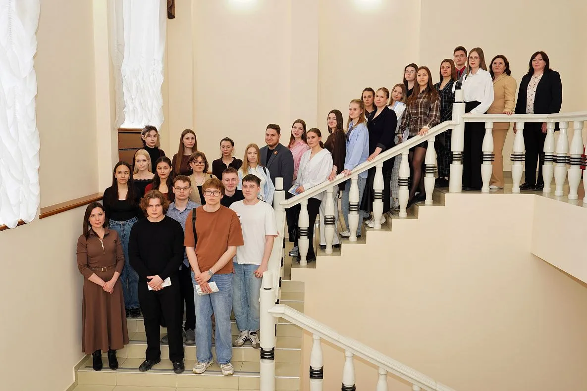 Перед студентами выступил старший научный сотрудник музея «Город» Дмитрий Калашников. Он рассказал ребятам об истории здания по проспекту Ленина, 18 и легендах, связанных с этим историческим зданием.