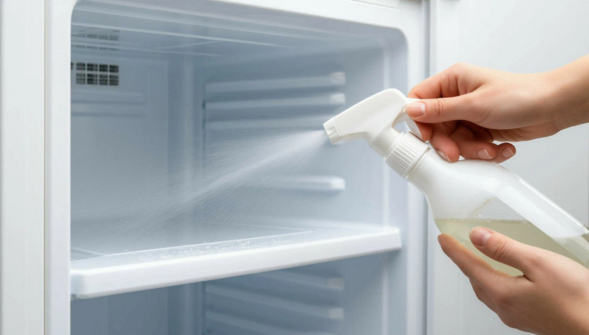 Приготовьте раствор, смешав 50-70 мл глицерина с 150-200 мл холодной воды. Распылите полученную смесь на сухие стенки морозильника, избегая области с электрическими элементами. Используйте безворсовую ткань, чтобы равномерно распределить глицерин, добиваясь легкого блеска без разводов.