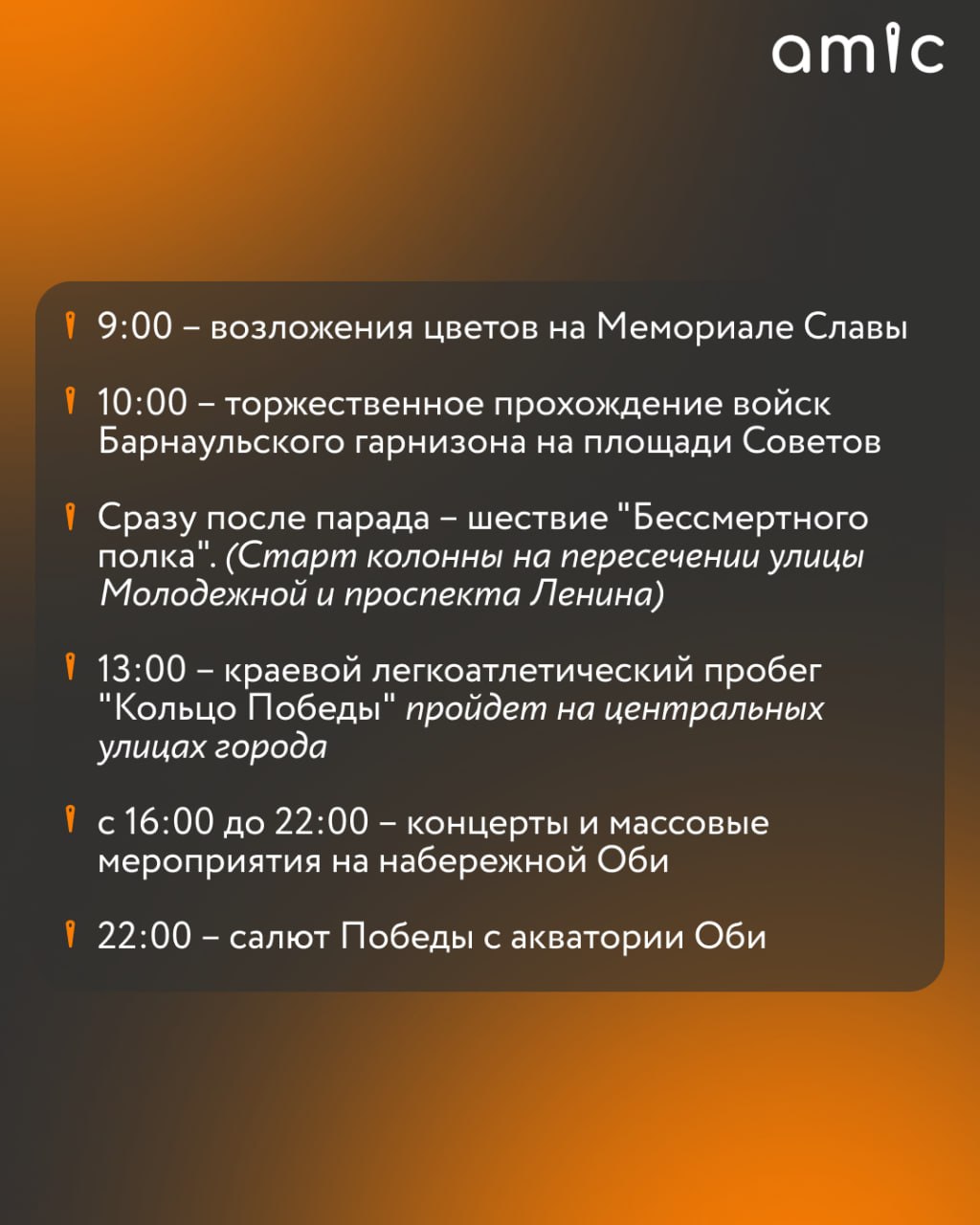 В параде на площади Советов примут участие более 1,6 тысячи человек — это 23 парадных расчета, а также сводный оркестр Росгвардии, МВД и МЧС. Около 500 участников парада — ученики школ Барнаула. В шествии "Бессмертного полка ожидается не менее 30 тыс. участников.