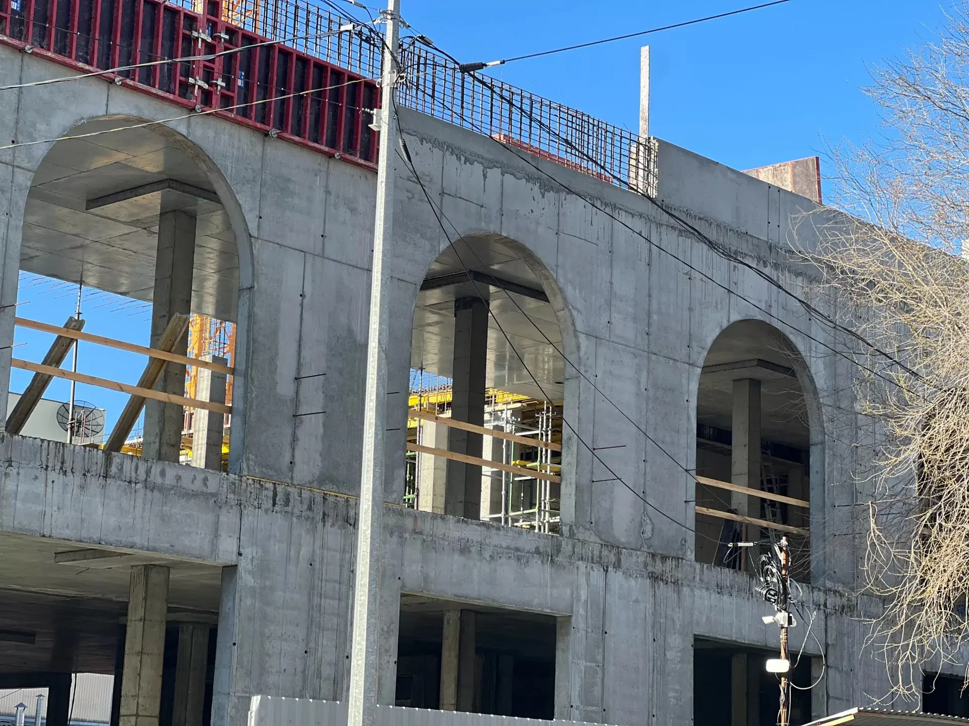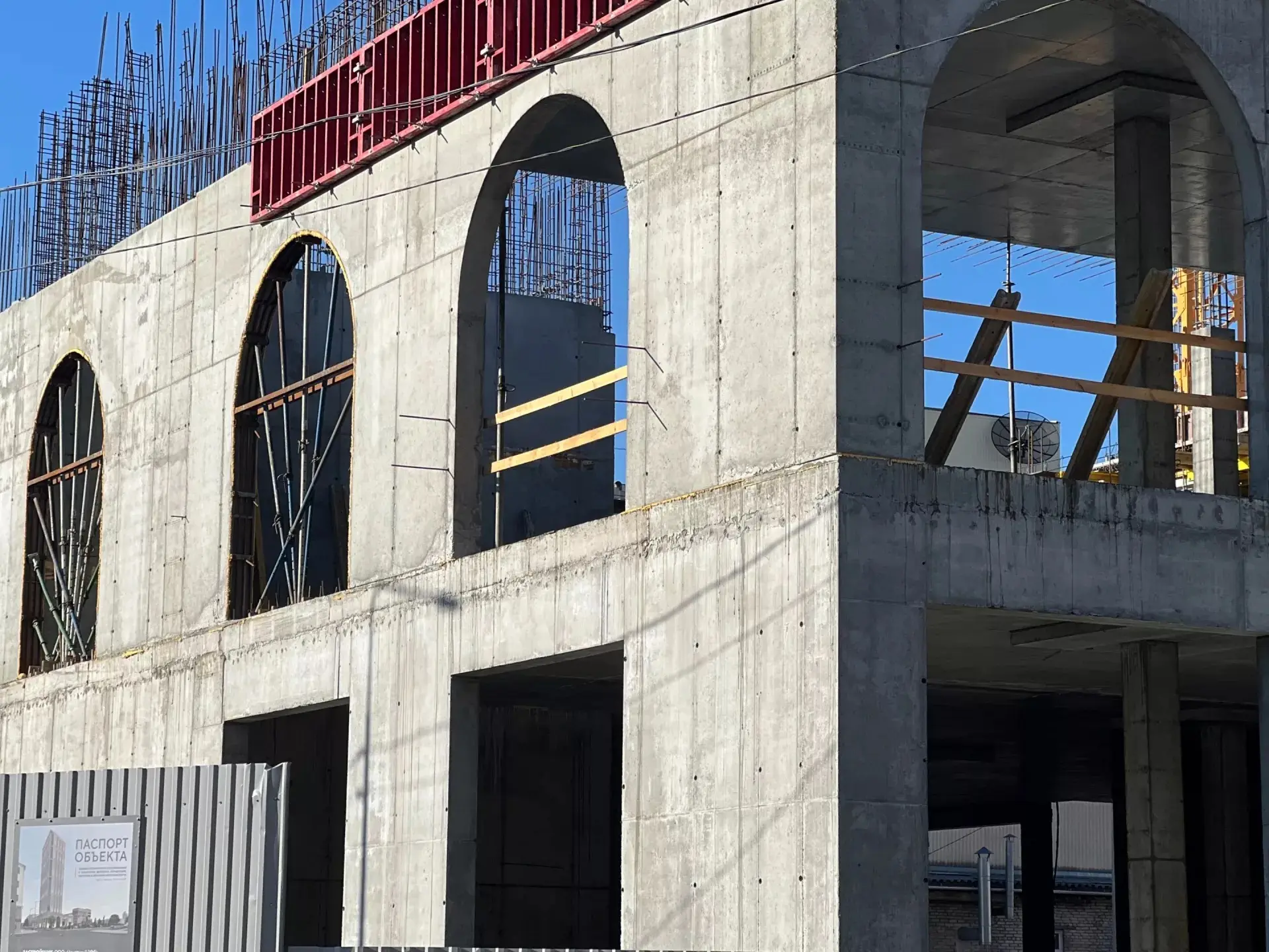Строители уже создали три этажа – подземный и два наземных. Прохожие могут наблюдать арочные конструкции, возвышающиеся за забором. Также на стройплощадке началось возведение конструкций двух башен.